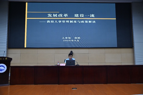张皓以“发展改革,建设一流,我校人事管理制度与政策解读”为题对学校师资队伍现状、师资队伍建设的背景与形势以及学校师资队伍建设的策略与举措进行了详细的阐述,介绍了在引进人才方面的资源分配以及通过人事改革提升办学水平的相关举措,并在解读人事管理相关政策文件上进行了概述。
