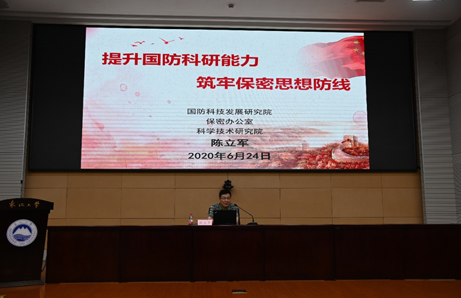 陈立军以“提升国防科研能力,筑牢保密思想防线”为题作报告,介绍了我校在推进国防科研工作方面的重要举措和未来规划,国家国防科技体系的设置和国防科研计划的种类,对如何引导教师承担国防科研项目提出了建议,并就当前保密形势、保密政策和如何确保保密安全进行了讲解。