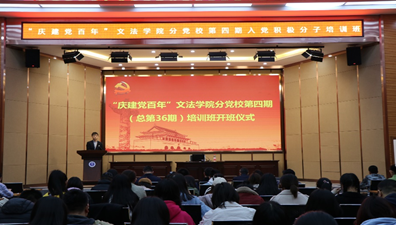 4月13日中午,“庆建党百年”文法学院党委党校第四期(总第36期)入党积极分子培训班开班仪式于文管学馆B230举行。东北大学正处级组织员、党委组织部副部长姜玉原,文法学院党委书记、分党校校长隋永强,文法学院党委副书记、纪委书记孙宏伟,文法学院党委副书记、副院长、分党校副校长夏风云应邀出席仪式。会议由彭舟主持。