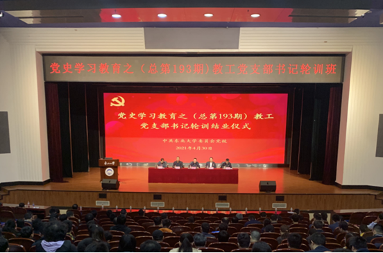 4月30日上午,党史学习教育之(总第193期)教工党支部书记轮训班在汉卿会堂蔡冠深报告厅举行结业式,校党委副书记、党校校长张国臣,校党委常委、组织部部长王辉,正处级组织员、组织部副部长姜玉原,党校副校长周莉出席结业式,现场200余名教工党支部书记和线上40余名秦皇岛分校教工党支部书记参加结业式。党校常务副校长初青松主持结业式。
