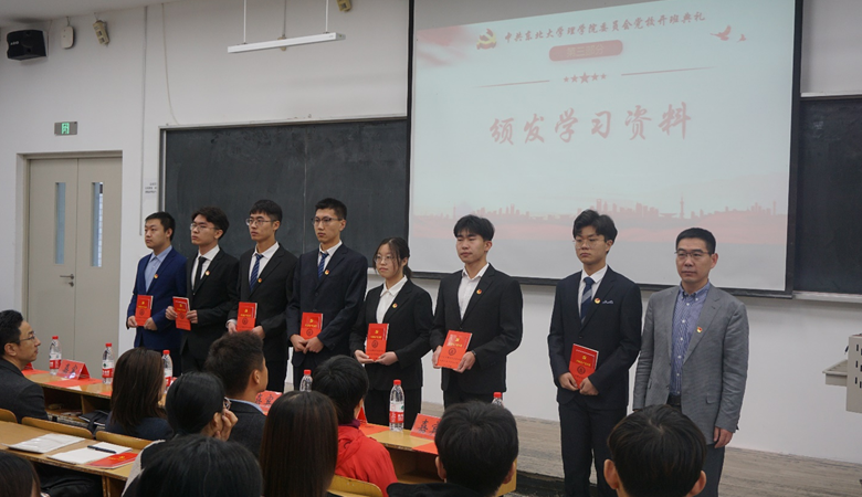 本轮培训分为视频课、开班仪式、理论课和讨论课四部分。开班仪式包括“我与信仰的对话”学员学党史汇报展示、红歌与学员宣誓、授教材笔记、党委书记致辞四个教育环节。在庄严的国歌声中开班仪式拉开了序幕,学员代表在视频课和自学党史的基础上,制作《百年峥嵘路》视频,讲述并回忆百年征程,感悟着信仰的力量。在嘹亮的红色歌曲和铮铮的誓言中,学员们表达对党和祖国的热爱,坚定严格遵守纪律、集中精力学习的决心。理学院党委党校校长吴政新为本次学员代表颁发教材以及学习笔记。