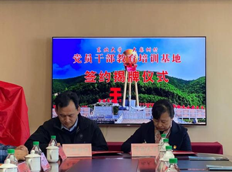 东北大学党校副校长周莉与毛正新签署《东北大学—大梨树村党员干部教育培训基地共建协议》。
