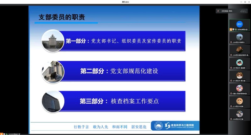 刘宇从党支部书记及支部委员的工作职责、党支部规范化建设、党员发展及转正工作、党员教育管理等四个方面对大家进行培训,重点解读了“三会一课”、主题党日、组织生活会等党支部工作制度,要求各个党支部通过召开党员大会、组织开展专题党课等形式学习贯彻落实党的二十大精神以及《中国共产党支部工作条例(试行)》《中国共产党普通高等学校基层组织工作条例》等党内法规条例。