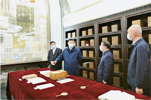 2023年6月2日,中共中央总书记、国家主席、中央军委主席习近平在北京出席文化传承发展座谈会并发表重要讲话。这是座谈会前,习近平1日下午在中国国家版本馆考察时,在兰台洞库了解馆藏精品版本保存情况。 新华社记者 鞠鹏/摄