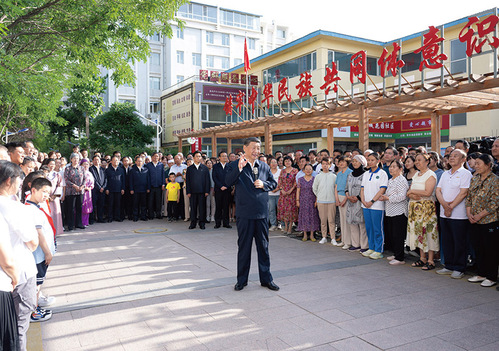 2024年6月19日至20日,中共中央总书记、国家主席、中央军委主席习近平在宁夏考察。这是19日下午,习近平在银川市金凤区长城花园社区考察时,同社区居民亲切交流。 新华社记者 谢环驰/摄
